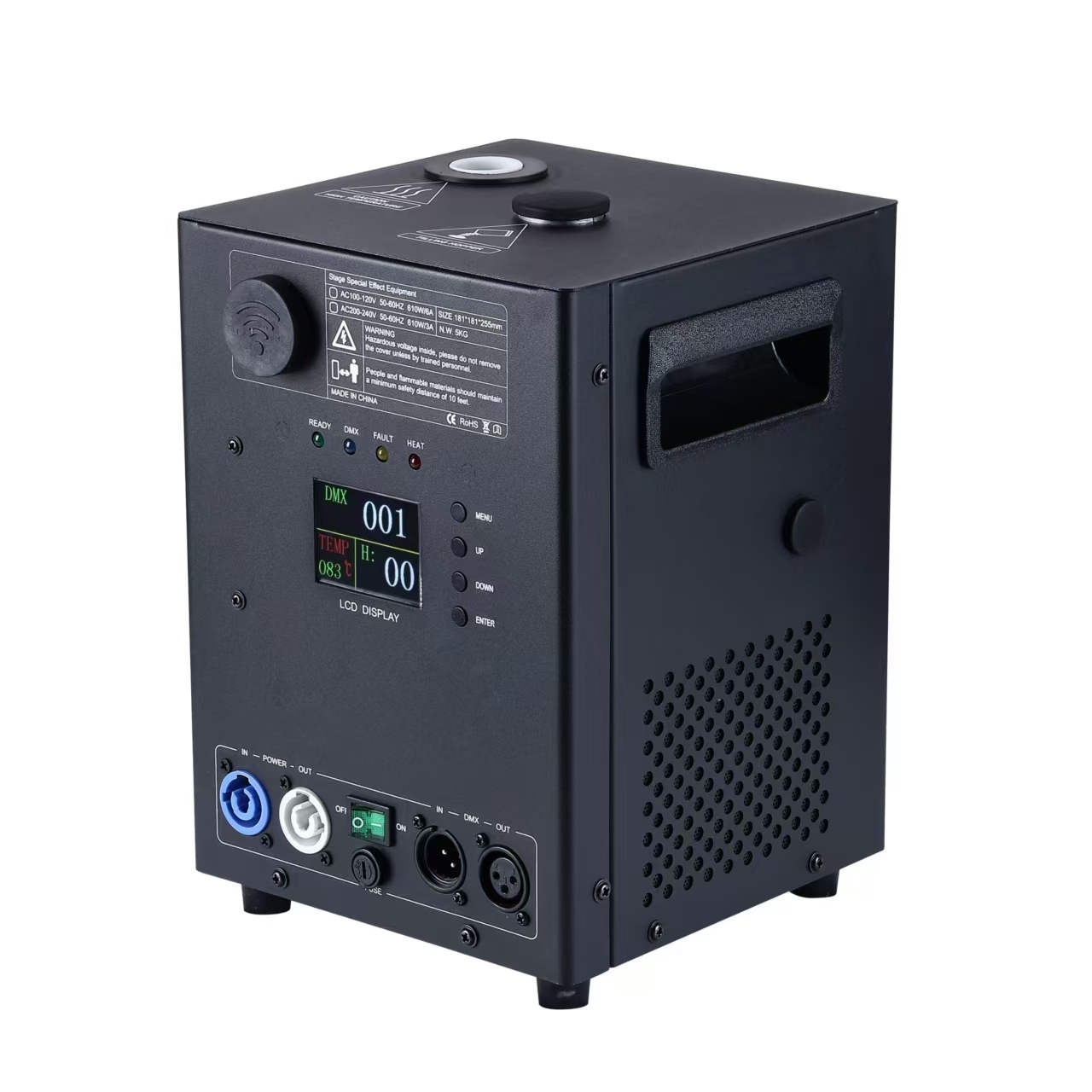 除DMX512控制以外,本機(jī)可使用遙控來(lái)控制加熱,噴花,清料等功能;